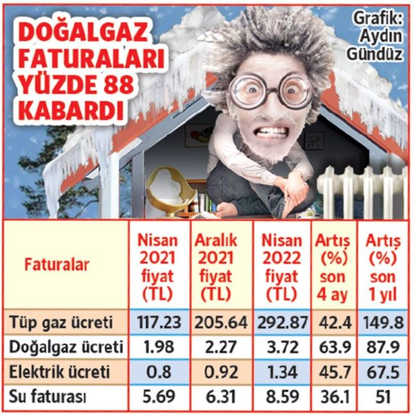 Gıdanın yanı sıra vatandaşa bir zam darbesi de faturalardan geldi. TÜİK'in kendi derlediği fiyat değişimlerine göre elektrik, su ve doğalgaz faturaları yüzde 150'lere varan oranlarda zamlandı. Tencereyi kaynatan mutfak tüpü son bir yıl içerisinde 117 liradan 293 liraya çıkarken doğalgaz birim ücreti de 1.98 liradan 3.72 liraya yükseldi. Elektrik birim ücreti 80 kuruştan 1 lira 34 kuruşa, su birim ücreti de 5.69 liradan 8.59 liraya çıktı.