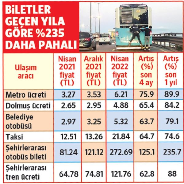 TÜİK'in verilerine göre şehir içi ve şehir dışı ulaşım ücretlerine de son bir yılda yüzde 125'i aşan oranlarda zam yapıldı. Mayıs başında yapılan zamlar hariç olmak üzere şehirlerarası otobüs bilet fiyatları bir yılda 81 liradan 273 liraya çıktı. Aynı dönemde şehir içi ulaşımda metro ücretleri yüzde 90, dolmuş ücretleri yüzde 84, belediye otobüsü bilet fiyatları da yüzde 79 zamlandı. Taksi zammı yüzde 75'e ulaştı.