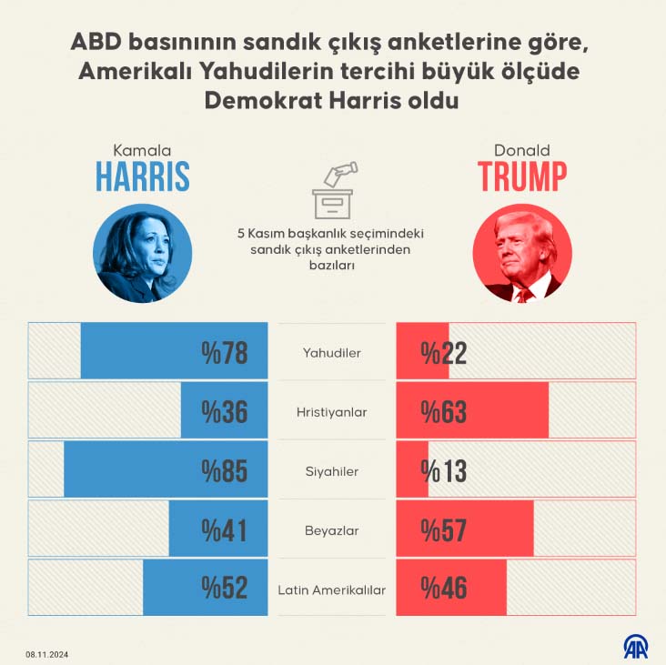 Buna göre, anketlerde Yahudilerin yüzde 78'i Harris'e oy verirken, yüzde 22'si Trump'ı tercih etti.