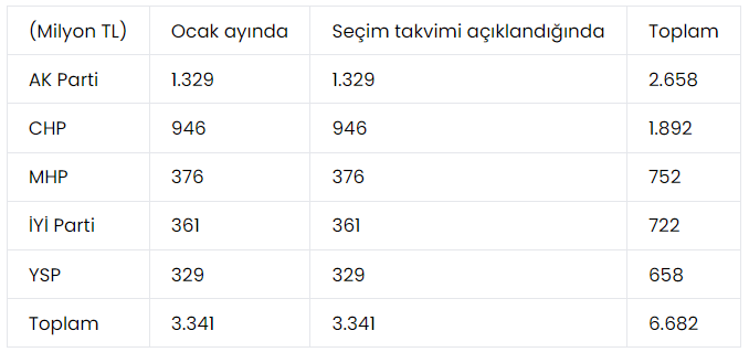 Kanun uyarınca, hazine yardımı yerel seçimlerin olduğu yıllarda normal tutarın 2 katı, milletvekili seçimi yıllarında ise 3 katı olarak uygulanıyor. Bu nedenle, Yüksek Seçim Kurulu’nun yerel seçim takvimini açıklamasının ardından beş siyasi partiye 10 gün içinde ocak ayındaki tutar kadar ikinci bir yardım yapılacak. Böylece toplam yardım tutarı 6 milyar 682 milyon liraya ulaşacak. AK Parti toplam 2 milyar 658 milyon lira, CHP 1 milyar 892 milyon lira, MHP 752 milyon lira, İYİ Parti 722 milyon lira, Yeşil Sol Parti de 658 milyon lira yardım alacak.