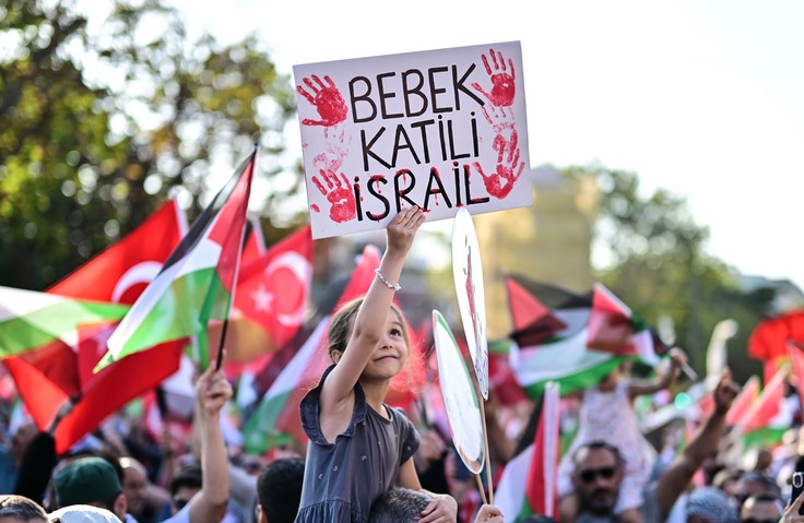 Türkçe, Arapça ve İngilizce yazılı dövizlerde ise "Gazze'de soykırım var", "İsrail soykırımı durdur", "Katliam bitsin, çocuklar ölmesin" ifadeleri yer aldı.