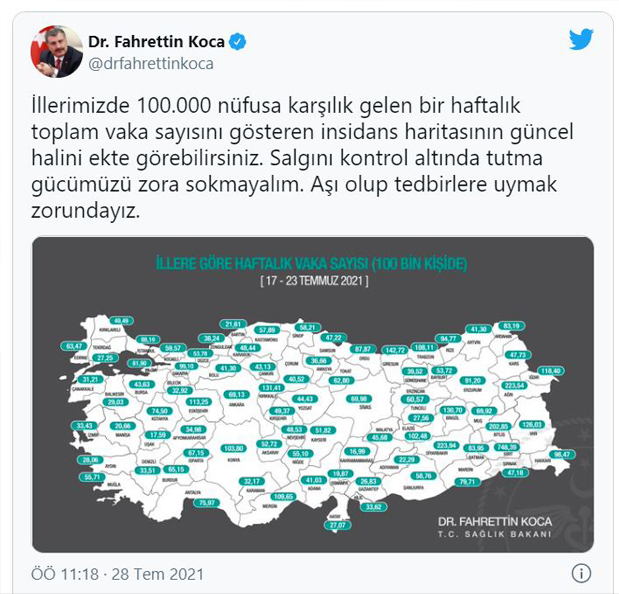 "Son bir haftada vaka sayısı en çok artan illerimiz Siirt, Diyarbakır, Bitlis, Giresun ve Iğdır. Vaka sayılarındaki artış ve aşılanma oranları arasında ilişki var. Aşı olup tedbirlere uyun."