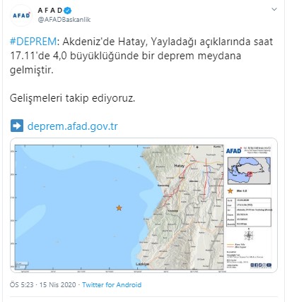 AFAD tarafından verilen bilgiye göre; Akdeniz'de Hatay, Yayladağı açıklarında saat 17.11'de 4,0 büyüklüğünde bir deprem meydana gelmiştir.
