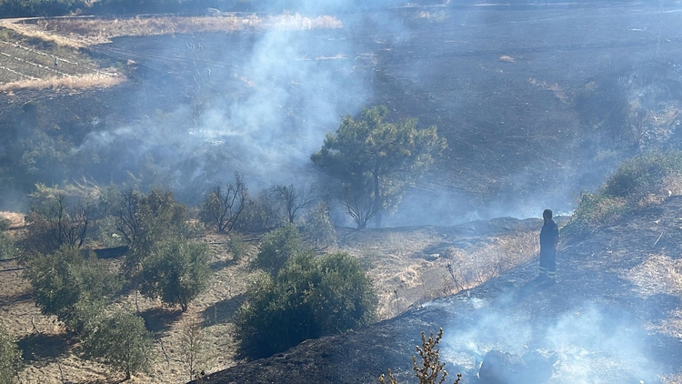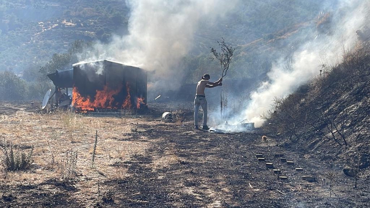 Kulübe ve arı kovanları ile 3,5 hektar zeytinlik ve ormanlık alanın zarar gördüğü bölgede soğutma çalışmaları sürüyor.
