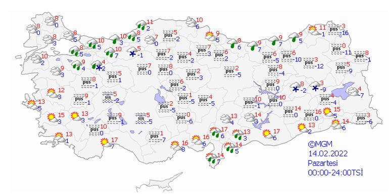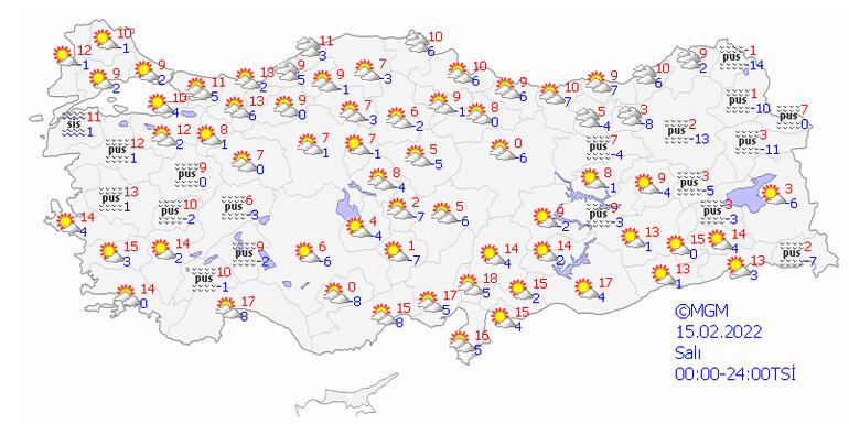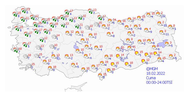 Meteoroloji Genel Müdürlüğü tarafından yapılan son değerlendirmelere göre; ülkenin kuzey ve doğu kesimlerinin parçalı ve çok bulutlu, Marmara’nın doğusu, Doğu Karadeniz kıyıları, Osmaniye, Hatay, Düzce, Zonguldak, Bartın, Ordu, Gaziantep ve Kilis çevreleri ile Balıkesir’in kuzey, Antalya'nın doğu, Adana ve Kastamonu’nun kıyı kesimlerinin yağmur ve sağanak yağışlı, Bilecik ve Bolu çevrelerinin karla karışık yağmur ve kar yağışlı, diğer yerlerin az bulutlu ve açık geçeceği tahmin ediliyor. Karadeniz'in iç ve yüksek kesimleri ile Doğu Anadolu'da yüksek kar örtüsüne sahip eğimli bölgelerde çığ riski bulunmaktadır. İç ve doğu kesimlerde buzlanma ve don olayı ile birlikte yer yer pus ve sis görüleceği tahmin ediliyor.