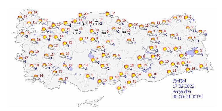 Parçalı ve az bulutlu geçeceği tahmin ediliyor. Gece ve sabah saatlerinde buzlanma ve don olayı ile birlikte pus, yer yer sis hadisesinin görülmesi bekleniyor.