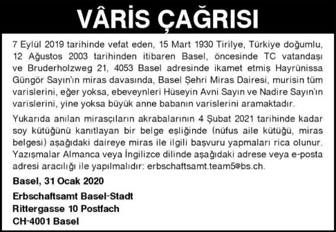 İsviçre’nin Basel şehrinde yaşayan ve geçtiğimiz yıl Eylül ayında vefat eden Hayrünissa Güngör Sayın’ın varisleri İsviçre Hükümeti tarafından gazete ilanıyla aranmaya başlandı.