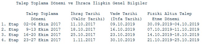 Hazine 2 Ekim 2017'den itibaren, belirlenen Ziraat Bankası şubeleri aracılığıyla, Türkiye genelinde etaplar halinde Altın Tahvili ve Altına Dayalı Kira Sertifikası talep toplama işlemleri ve ihracı gerçekleştirecek.