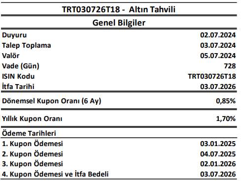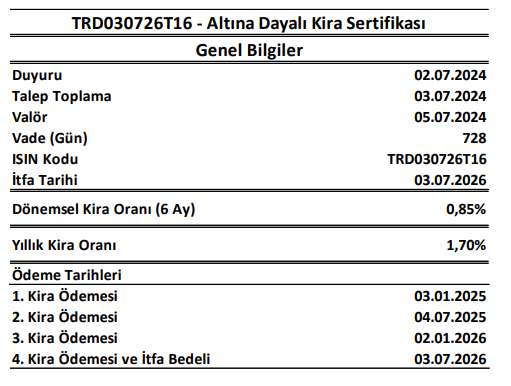 tfa tarihinde yatırımcılara, hesaplarında bulunan 995 adet altın tahvili / altına dayalı kira sertifikası karşılığında, yukarıda belirtilen niteliklere uygun olan LBMA Sertifikalı 995/1000 saflıkta 1 kilogramlık külçe altınlar teslim edilecektir. Kira / kupon ödemeleri ile itfa işlemlerine ilişkin detaylı bilgiye yatırımcı kılavuzundan ulaşılabilmektedir.