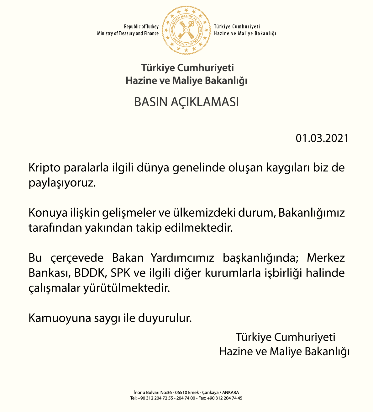 Hazine ve Maliye Bakanlığı'ndan yapılan kripto paralar dair yazılı açıklamada, "Kripto paralarla ilgili dünya genelinde oluşan kaygıları biz de paylaşıyoruz" denildi.