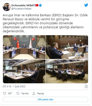 Hazine ve Maliye Bakanı Nureddin Nebati, Avrupa İmar ve Kalkınma Bankası (EBRD) Başkanı Odile Renaud-Basso ile çevrimiçi bir görüşme gerçekleştirdi.