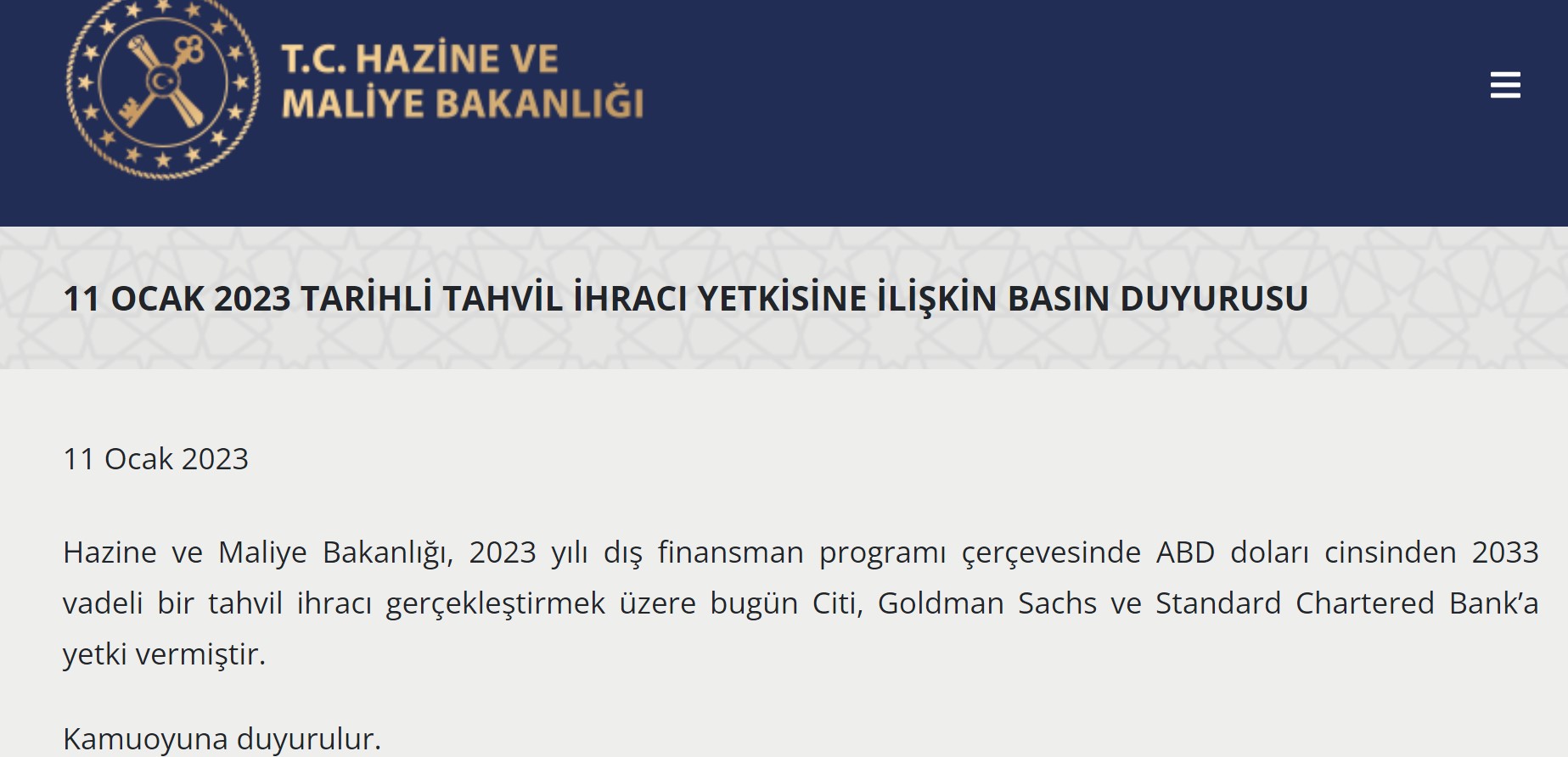 Bakanlık duyurusunda, 2023 yılı dış finansman programı çerçevesinde ABD doları cinsinden 2033 vadeli bir tahvil ihracı gerçekleştirmek üzere Citi, Goldman Sachs ve Standard Chartered Bank yetkilendirildi.