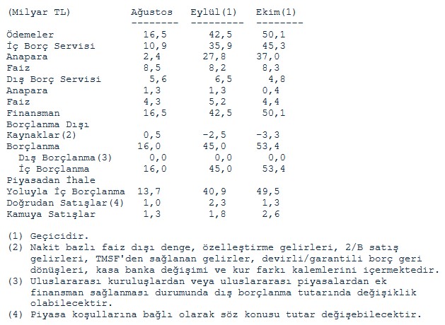 Ekim ayında toplam 45,3 milyar TL’lik iç borç servisine karşılık toplam 53,4 milyar TL’lik iç borçlanma yapılması programlanıyor.