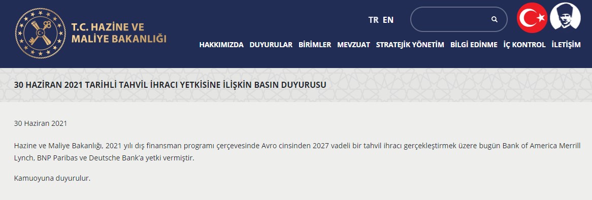 Bakanlığın internet sitesinde yer alan duyuruda, "Hazine ve Maliye Bakanlığı, 2021 yılı dış finansman programı çerçevesinde euro cinsinden 2027 vadeli bir tahvil ihracı gerçekleştirmek üzere bugün Bank of America Merrill Lynch, BNP Paribas ve Deutsche Bank’a yetki vermiştir." ifadeleri kullanıldı.