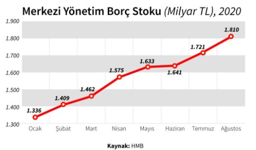 Hazine ve Maliye Bakanlığı verilerine göre, 2020’nin başında 1 trilyon 329 milyar TL olan merkezi yönetim borç stoku, 8 ayda tam 481 milyar TL yükselerek 1 trilyon 810 milyar TL’ye ulaştı. 8 aydaki artış oranı yüzde 36,2 oldu.