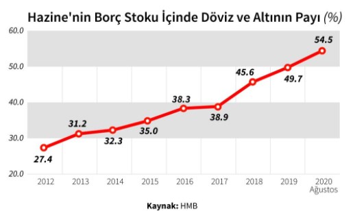 Yıl başında 660,5 milyar TL seviyesinde olan Hazine’nin döviz cinsi borç stoku, ağustos sonunda 986,1 milyar TL’ye yükseldi. Artış oranı yüzde 49,3 oldu. Toplam borç içinde döviz cinsi borçların payı, yıl başında yüzde 49,7 iken, ağustosta yüzde 54,5’e ulaştı. Bu oran, 2017 sonunda 38,9 idi.