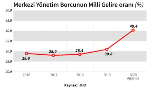 Hazine’nin borç stokunun milli gelire oranı, yıl başında yüzde 30,8 iken, ağustosta yüzde 40,4 fırladı. Böylece milli gelire oranla borç stokunda tarihi bir sıçrama kaydedilmiş oldu.