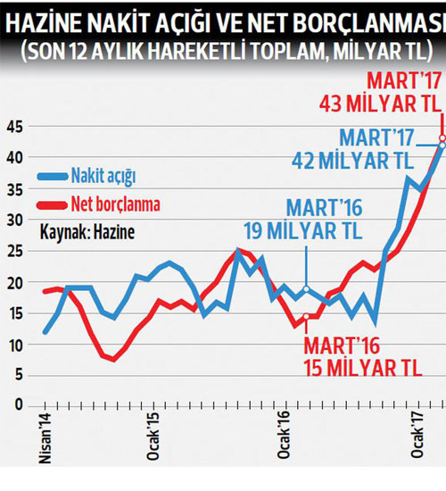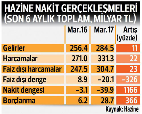 2016 yılı mart ayında, 2015 Ekim-2016 Mart arasını içeren son 6 ayda, devlet faiz ödemeleri dışında toplam 247.5 milyar TL nakit harcama yaparken, bu yıl aynı 6 aylık dönemdeki harcamalar 304.7 milyar TL’ye çıkmış. Bu, yüzde 23’lük bir artışa karşılık geliyor. Oysa aynı dönemdeki toplam nakit gelirlerdeki artış ise sadece yüzde 11. Böylece bu dönemdeki devletin nakit açığı 39.8 milyar TL olurken, önceki yılın aynı ayına göre 12 kattan fazla artmış olduğunu söylüyor.