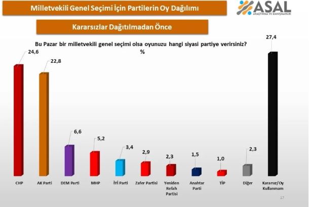 Kararsız/oy kullanmam seçeneğinin dağıtılmasının ardından ise CHP'nin birinci parti olduğu görüldü.