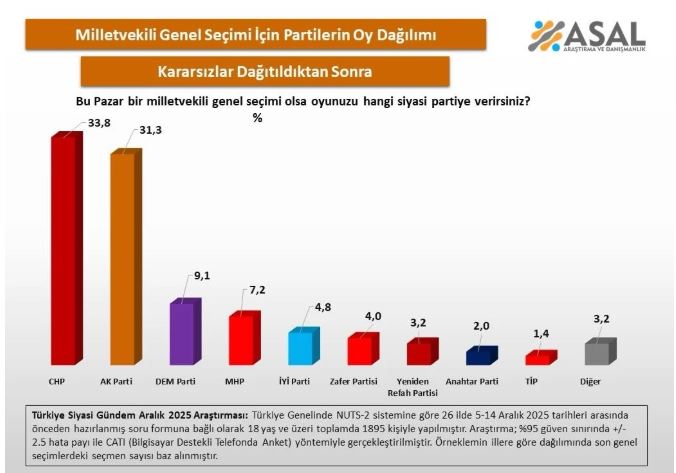 Asal Araştırma, yılın son anketini paylaştı. 26 ilde 5-14 Aralık tarihleri arasında bin 895 katılımcı ile gerçekleştirilen anketin güven sınırı yüzde 95, hata payı ise + - yüzde 2.5 olarak belirtildi.