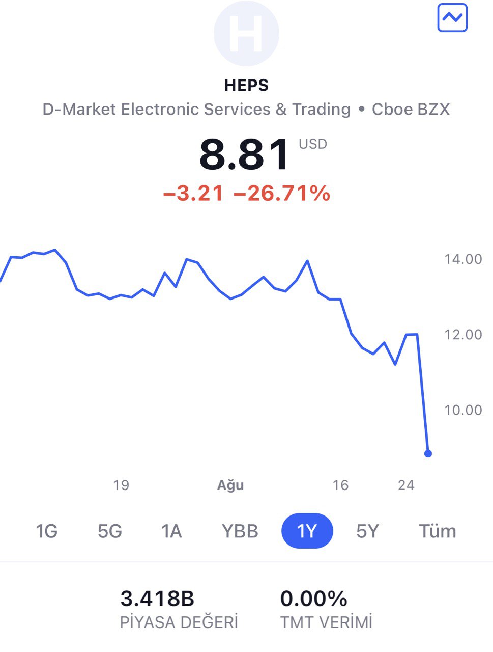Resmi ismi D-Market Elektronik Hizmetler ve Ticaret AŞ olan ve Nasdaq’da halka arz edilen ilk Türk şirketi olan Hepsiburada (#HEPS) önce 14 dolara kadar yükseldikten sonra sert düşüşlere sahne oldu. Dün en sert düşüşünü kaydeden hissenin piyasa değeri 3 milyar 415 milyon dolara geriledi. Halka arzdan bugüne yaklaşık 500 milyon dolar buharlaştı.