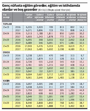 Öncelikle şu gerçeğin altını çizelim. Genç nüfusun eğitim görmeyen ve çalışmayanlarının oranında öyle yıldan yıla kayda değer düzeyde ne iyileşme var, ne kötüleşme. Biz tablomuzda son iki yılın mayıs aylarındaki duruma yer verdik. Önceki yılların verilerinde de oran olarak çok büyük farklılık olmadığını belirtelim.