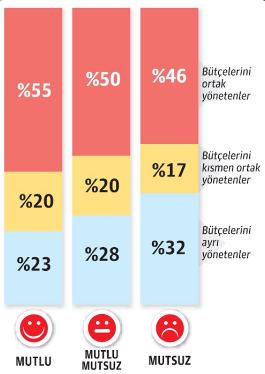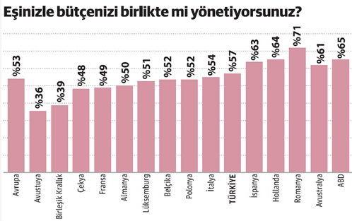 Yayınlanan son sonuçlara göre; Amerikalı çiftlerin yüzde 65’i,Avustralyalı çiftlerin yüzde 61’i, Avrupalı çiftlerin ise yüzde 53’ü kazançlarını birlikte yönetiyor ve birlikte birikim yapıyor. Türkiye ise bu konuda yüzde 59’luk bir oranla Avrupa ortalamasının üzerinde ve 13 Avrupa ülkesi arasında 4. sırada yer alıyor. Yani Türkiye’de her 5 çiftten 3’ünün kazanç ve harcamaları ortak yönetiliyor ve bu durum ilişkilerini de olumlu yönde etkiliyor. Türkiye’de her 10 çiftten 7’si ortak bütçe yönetiminin ve para hakkında konuşmanın ilişkilerini ve finansal durumlarını güçlendirdiğini belirtiyor.