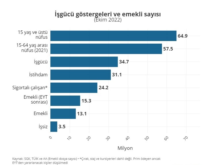 TÜİK’e göre Ekim 2022’de 15 yaş ve daha yukarı yaştaki nüfusu sayısı ise 64,9 milyon. Bu kişilerin 34,7 milyonu işgücünde. Yani istihdamda veya işsiz. İstihdamdakilerin sayısı 31,2 milyon; işsiz sayısı ise 3,5 milyon. TÜİK’in 2021 yılı verilerine göre 15-64 yaş arasındaki nüfus sayısı ise 57,5 milyon.