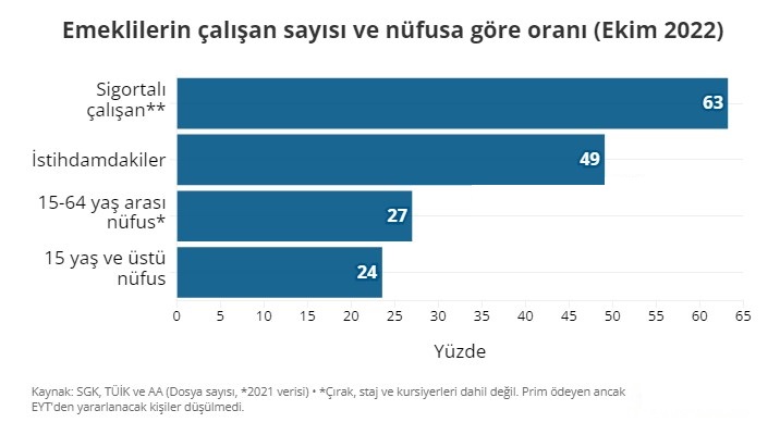 Emeklilerin sigortalı çalışanlara oranı ise yüzde 63. Yani 158 sigortalı çalışana karşın 100 emekli var. Emekli sayısının çalışma çağı olarak kabuk edilen 15-64 yaş arası nüfusa oranı yüzde 27. Emekli sayısının 15 yaş ve üzeri nüfusa oranı ise yüzde 24. Bu da 15 yaş ve üzerindeki 4 kişiden birisinin emekli olduğu anlamına geliyor.