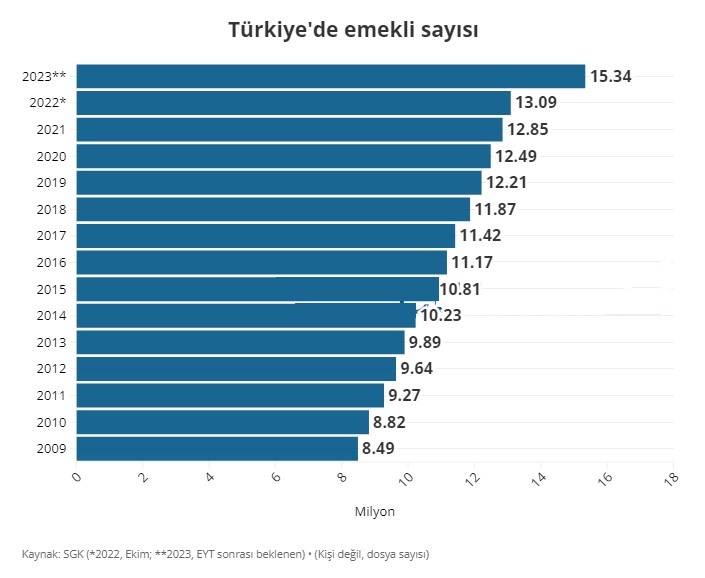SGK verilerine göre 2009’de emekli sayısı 8,49 milyon idi. 2021 sonunda 12,85 milyonu aşan emekli sayısı EYT sonrası 15,34 milyona ulaşacak. Böylece 2013-2023 dönemini kapsayan son 10 yılda emekli sayısı yüzde 55 artmış olacak.