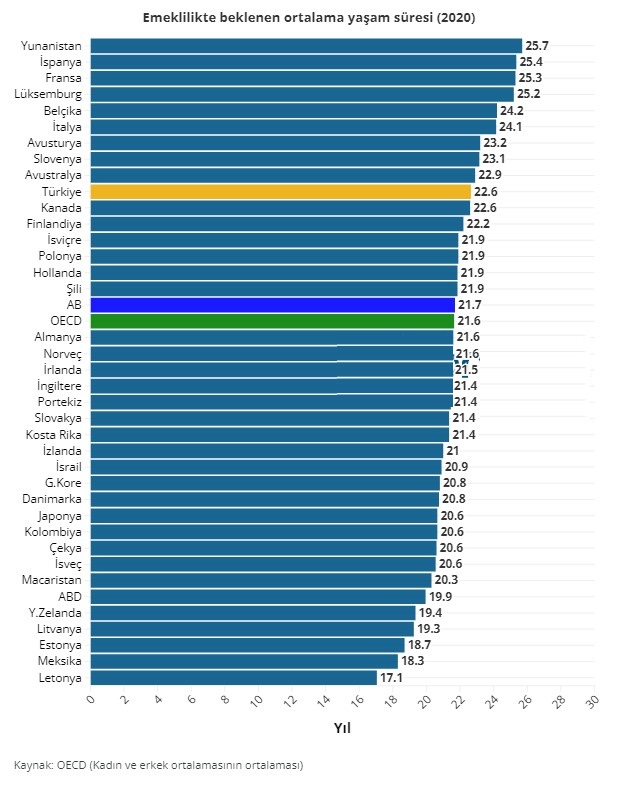 Ekonomik İşbirliği ve Kalkınma Örgütü (OECD) verilerine göre 2020 yılında Türkiye’de emeklilikte beklenen yaşam süresi 22,6 sene. AB ortalaması ise 21,7 sene.
