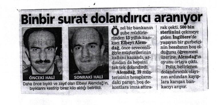 İngiltere'de yaşayan bir müşterinin hesabındaki 500 bin sterlinin kaybolduğunu ihbar etmesi üzerine, banka müfettişleri soruşturma başlattı. Hesaplar incelediğinde zimmet ortaya çıktı. Şüphelinin müşterileriyle iyi ilişkiler kurduğu, sözde yeni hesap için gerekli olduğunu söyleyip boş dekontlar imzalattığı tespit edildi. Elbeyi A.'nın bu yöntemle 39 banka müşterisinin hesaplarını boşalttığı tespit edilirken, hakkında yakalama kararı çıkartıldı. Elbeyi A.'nın, 2004 yılından bugüne, sürekli görünümünü ve yerini değiştirerek izini kaybettirdiği belirtildi.