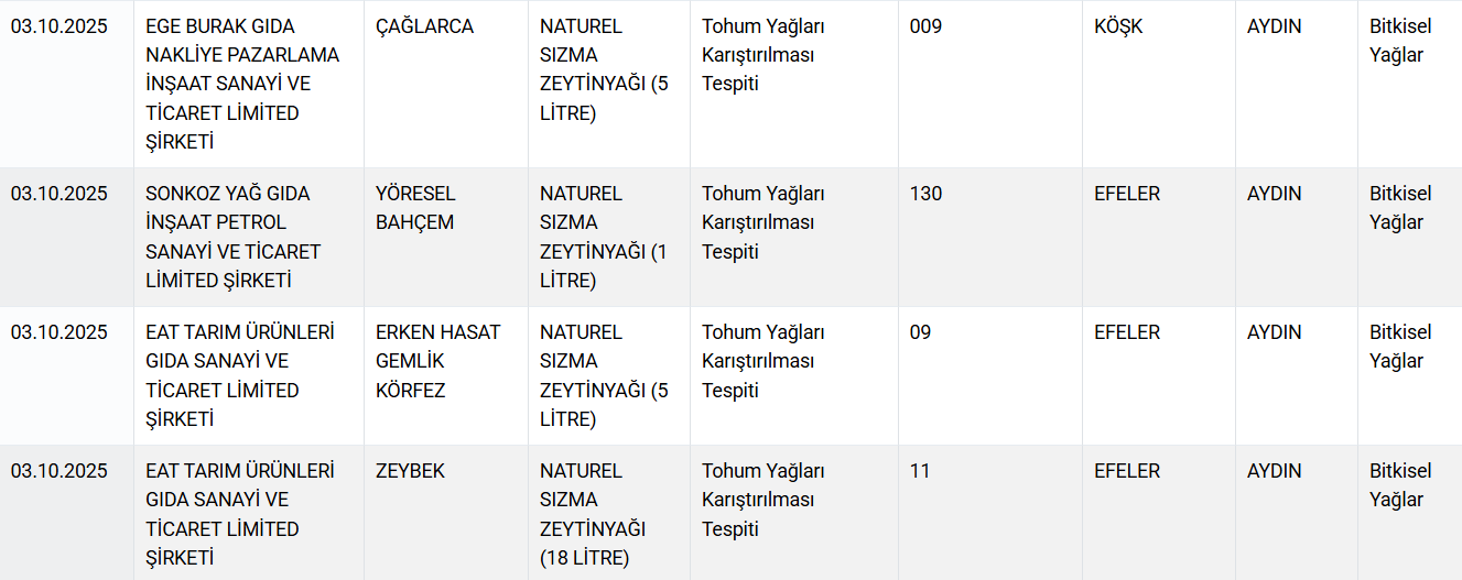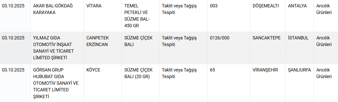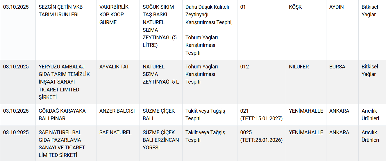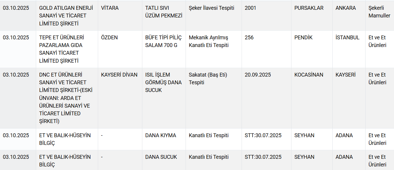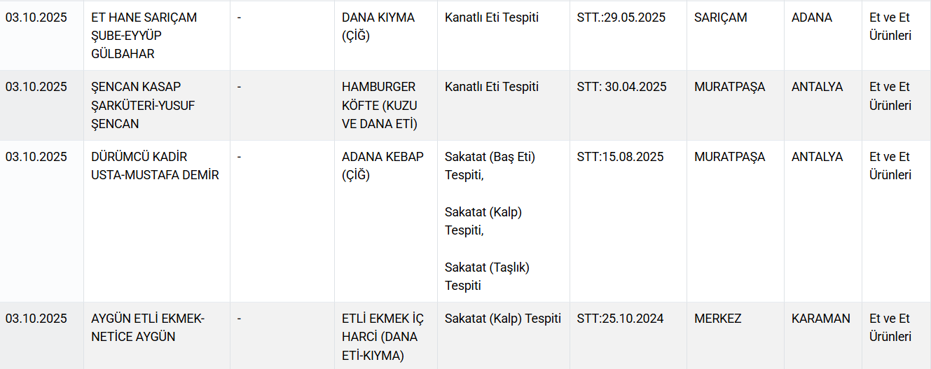 Bakanlığın kontrollerinde, dana kıyma ve sucuklarda kanatlı eti karışımı, Adana kebapta baş ve kalp eti kullanımı ile bazı salam ürünlerinde mekanik olarak ayrılmış kanatlı eti olduğu belirlendi. Ayrıca, zeytinyağlarında düşük kaliteli yağ ve tohum yağlarının karıştırıldığı, bal ürünlerinde ise taklit ve tağşiş uygulamalarına rastlandı.