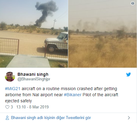 Hindistan Hava Kuvvetleri'ne ait MiG-21 Bison tipi bir savaş uçağının Pakistan sınırı yakınlarında düştüğü belirtildi.