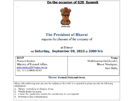 G20 Devlet Başkanları ve bakanların katılacğı akşam yemeği davetinde de "Bharat Başkanı"ndan.... ifadesi yer aldı.