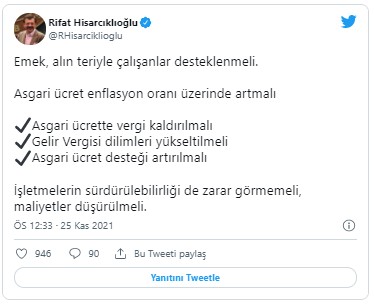 TOBB Başkanı Hisarcıklıoğlu, Twitter hesabından yaptığı paylaşımında "Emek, alın teriyle çalışanlar desteklenmeli. Asgari ücret enflasyon oranı üzerinde artmalı" ifadelerini kullandı.