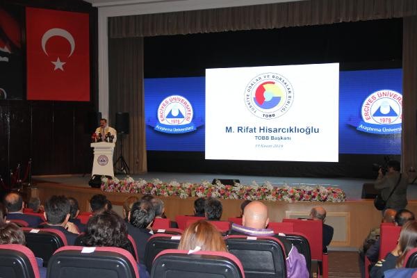 Erciyes Üniversitesi (ERÜ) 2019- 2020 Akademik Yılı Açılış Töreni'ne TOBB Başkanı Rifat Hisarcıklıoğlu, Vali Şehmus Günaydın, Büyükşehir Belediye Başkanı Memduh Büyükkılıç, Erciyes Üniversitesi Rektörü Prof. Dr. Mustafa Çalış, akademisyenler ve öğrenciler katıldı. Burada öğrencilere girişimcilik konusunda tavsiyede bulunan Hisarcıklıoğlu, girişimciliğin olmadığı yerde rekabet ve kalitenin olmayacağını söyledi. Ülkelerin girişimci ithal ettiğini belirten Hisarcıklıoğlu, "Dünyada milletlerin gücü toplarıyla tüfekleriyle değil, girişimci gücüyle ölçülüyor. Girişimci insanı herkes tepsinin üstünde gezdiriyor. Barış Pınarı Harekatı'nda bunu gördük, ekonomik güce ihtiyaç var. O bombayı yapmak için bir Türk girişimcisine ihtiyaç var. Türkiye'de her bir girişimci yanında 10 kişiye istihdam sağlıyor. 1 milyon 500 bin üyemiz var. Toplam 15 milyon istihdam demektir. Her yıl bir milyon kişiye iş bulacaksınız. Çünkü nüfusa katılım var. Girişimcilik onun için olmazsa olmazdır. '1 kişiye 10 istihdam' diyoruz. Sayımızı arttırmamız lazım. Bugün evlerimizde huzurla yatmak istiyorsak, bunu yapmalıyız" dedi.