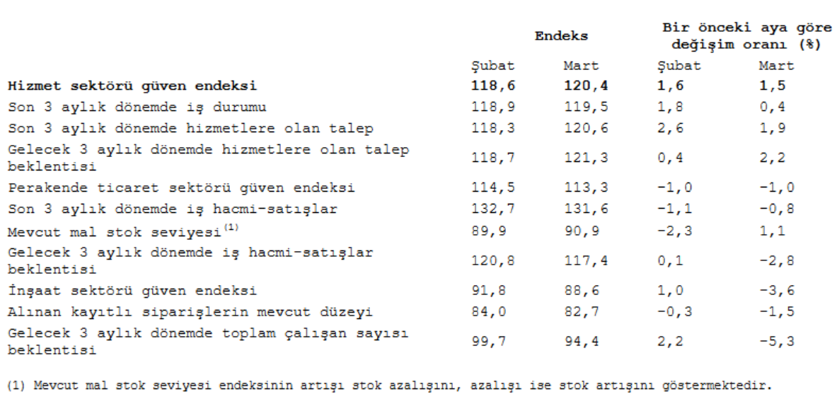 Mevsim etkilerinden arındırılmış güven endeksi mart ayında bir önceki aya göre; hizmet sektöründe %1,5 oranında artarak 120,4 değerini, perakende ticaret sektöründe %1,0 oranında azalarak 113,3 değerini ve inşaat sektöründe %3,6 oranında azalarak 88,6 değerini aldı.