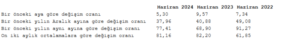 Buna göre H-ÜFE, haziranda bir önceki aya kıyasla yüzde 5,3, geçen yılın aralık ayına göre yüzde 37,96, geçen yılın aynı ayına göre yüzde 77,41 ve 12 aylık ortalamalara göre yüzde 81,16 yükseldi.