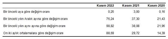 Türkiye İstatistik Kurumu (TÜİK) tarafından yapılan açıklamaya göre, 2022 yılı Kasım ayında H-ÜFE (2017=100) bir önceki aya göre %0,25, bir önceki yılın Aralık ayına göre %76,24, bir önceki yılın aynı ayına göre %98,82 ve on iki aylık ortalamalara göre %88,69 artış gösterdi.