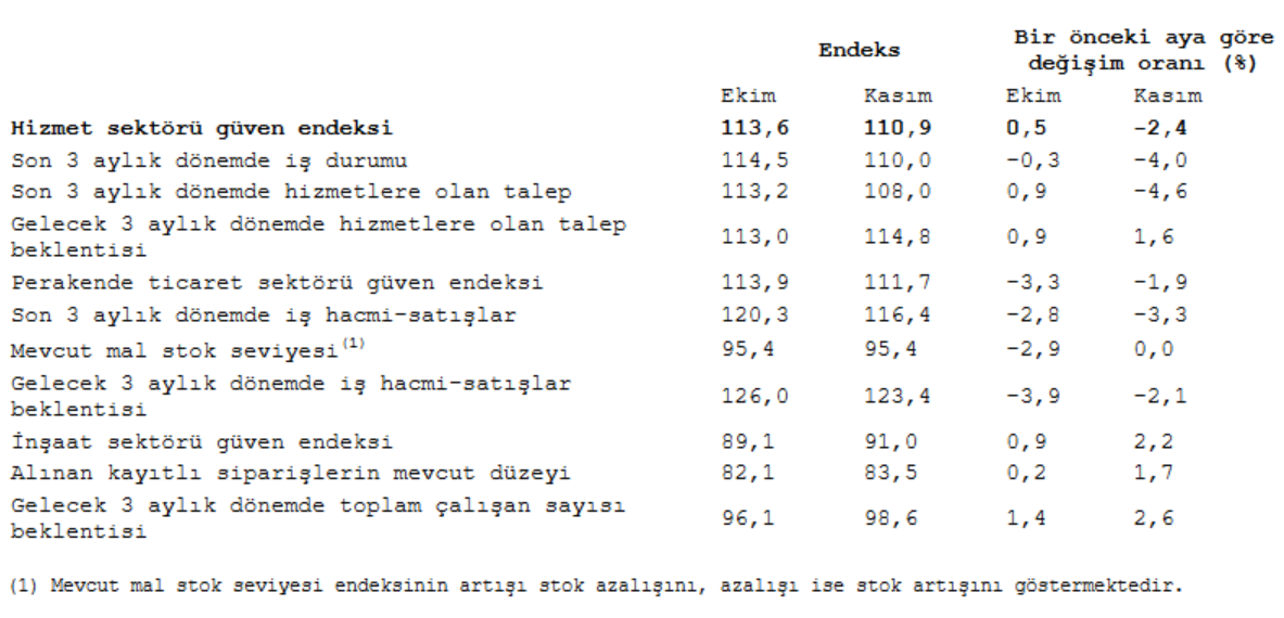 Türkiye İstatistik Kurumu (TÜİK) tarafından yapılan açıklamaya göre, mevsim etkilerinden arındırılmış güven endeksi Kasım ayında bir önceki aya göre; hizmet sektöründe %2,4 oranında azalarak 110,9 değerini, perakende ticaret sektöründe %1,9 oranında azalarak 111,7 değerini ve inşaat sektöründe %2,2 oranında artarak 91,0 değerini aldı.