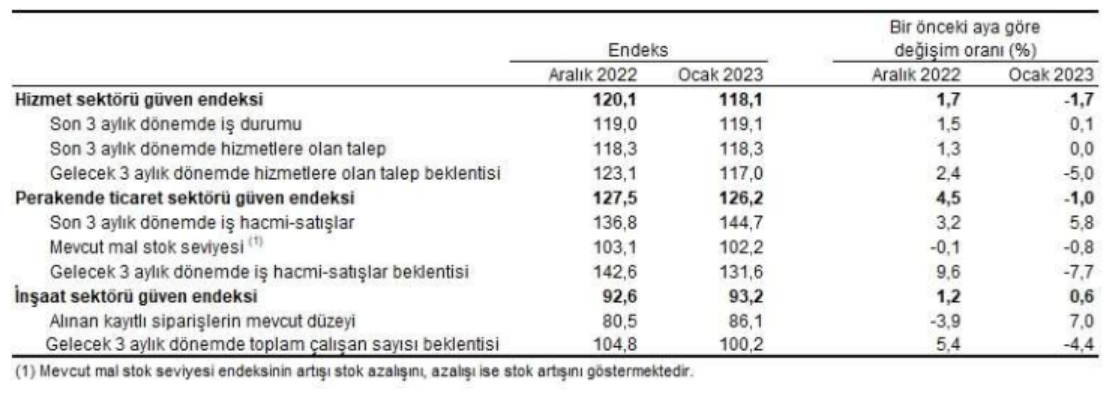 Türkiye İstatistik Kurumu (TÜİK) tarafından yapılan açıklamaya göre, Mevsim etkilerinden arındırılmış güven endeksi 2023 Ocak ayında bir önceki aya göre; hizmet sektöründe %1,7 ve perakende ticaret sektöründe %1,0 azalırken, inşaat sektöründe %0,6 arttı.