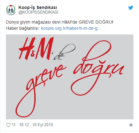 Sendikanın internet sitesinde yer alan duyuruya göre, Koop-İş Sendikası ile H&M arasında toplu iş sözleşmelerinde anlaşma sağlanamaması nedeniyle 4 Ekim’de grev kararı alındı.