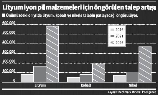 Dünya genelinde hâlihazırda yıllık bir milyon olan elektrikli araç satışlarının, 2025'te 14 milyonu geçmesi bekleniyor. Elektrikli araç üretimdeki söz konusu hızlı artış pil yapımında kullanılan malzemelerin tüketimini de tetikleyecek.
