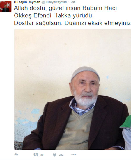 Alınan bilgiye göre, uzun süredir özel bir hastanede tedavi gören Kültür ve Turizm Bakan Yardımcısı Hüseyin Yayman'ın babası Ökkeş Yayman (87) yaşamını yitirdi.
