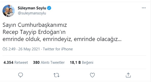 İçişleri Bakanı Süleyman Soylu, kişisel Twitter hesabında yaptığı paylaşımla Cumhurbaşkanı Recep Tayyip Erdoğan'a teşekkür etti.