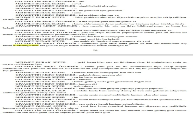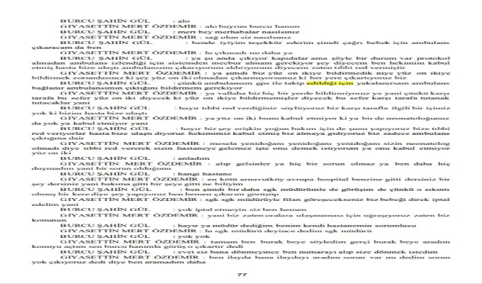 Bir başka kayıtta, Özdemir hastanenin özel hemşirelik birimi yöneticisi Burcu Şahin Gül ile görüşüyor. Gül, telefonla aradığı Özdemir'e, " Ambulansım GPS ile takip edildiği için yakalanırsam, ambulansım bağlanır, ambulansımın çıktığını bildirmem gerekiyor" diyor. Özdemir, kendilerinin hiçbiryere bildirmediğini belirterek yanıt veriyor. Aralarında geçen görüşmenin ardından Gül, yöneticisi ile konuştuğunu ve sorunu çözdüğünü belirtiyor.
