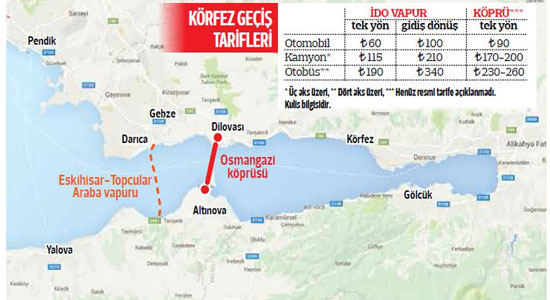 Mevcut tariflerde otomobiller tek yön için feribota 60 TL ödüyor. Gidiş-dönüş bilet alındığında tek yön fiyatı 50 TL’ye düşüyor. Geçtiğimiz günlerde Osmangazi Köprüsu geçiş ücretinin otomobiller için 90 TL olarak belirlenmesi yönünde çalışma yapıldığı belirtilmişti. Eğer bu tarifler geçerli olursa feribot-köprü rekabetinde feribot otomobil sürücülerine yaklaşık yüzde 45 fiyat avantajı sunacak. Ancak bekleme-inme-binme ve 30 dakikalık geçiş süresiyle yaklaşık 45 dakikayı bulan yol süresi köprü sayesinde 4 dakikaya inecek. Kamyonların feribotlara ödediği ücret ise şu anda tek yön 115 TL. Gidiş-dönüş bilette bu fiyat 105 TL’ye geriliyor. Kamyonların yeni köprüden tek yön geçiş ücretinin ise 170-200 TL aralığında belirlenmesi bekleniyor. Bu tablo resmiyet kazanırsa taşıma maliyetlerinde önemli bir kalem tutan Körfez geçişinde feribot yarıya yarıya fiyat avantajı sunarak rekabette bir adım öne çıkacak.
