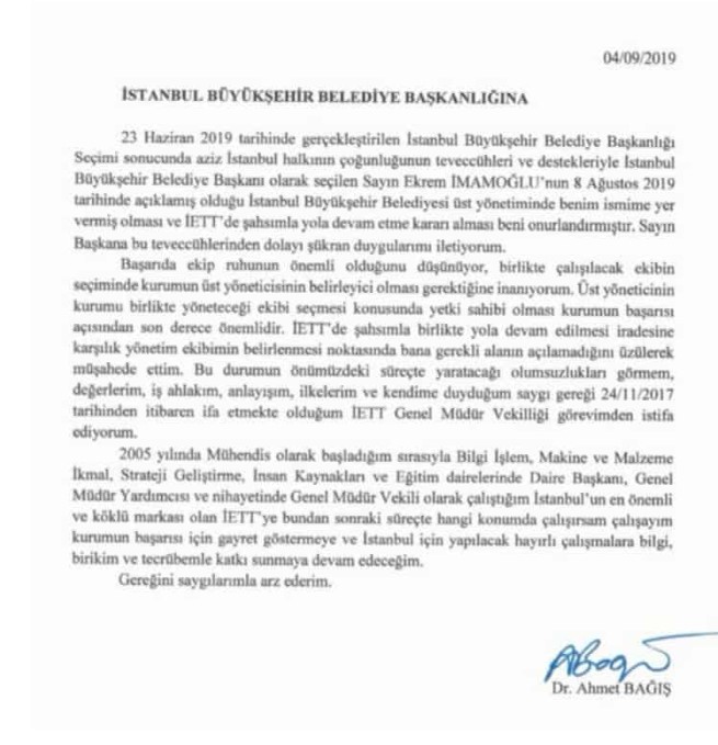 İETT Genel Müdürü Ahmet Bağış, Twitter hesabı üzerinden yaptığı paylaşımda görevinden istifa ettiğini duyurdu.