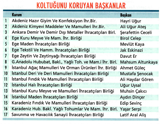 17 ihracatçı birliğinde ise mevcut başkanlar yerlerini korudu. Şimdi gözler haziran ayında yapılacak TİM Başkanlığı seçimlerine çevrilmiş durumda. Başkanlık için güçlü isimlerin yarışta olduğu kulislerde konuşuluyor. Bu isimler arasında, İsmail Gülle, Tahsin Öztiryaki, Haluk Okutur, Fuat Tosyalı, Bülent Aymen ve Hikmet Tanrıverdi gibi önemli ihracatçılar bulunuyor.